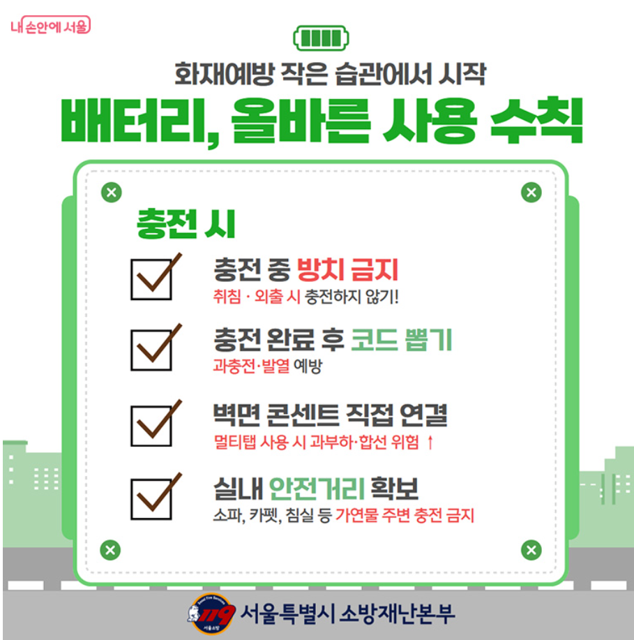 리튬이온 배터리는 우리 생활에 많은 편리함을 주는 동시에, 잘못된 사용시 심각한 위험이 존재합니다. 충전 직후 코드 뽑기와 같은 간단한 습관이 대형 화재와 인명 피해를 예방할 수 있음을 잊지 마시기 바랍니다. 개인이 할 수 있는 미세한 주의와 실천이, 가족과 이웃의 삶을 지키는 가장 강력한 방패가 됩니다.